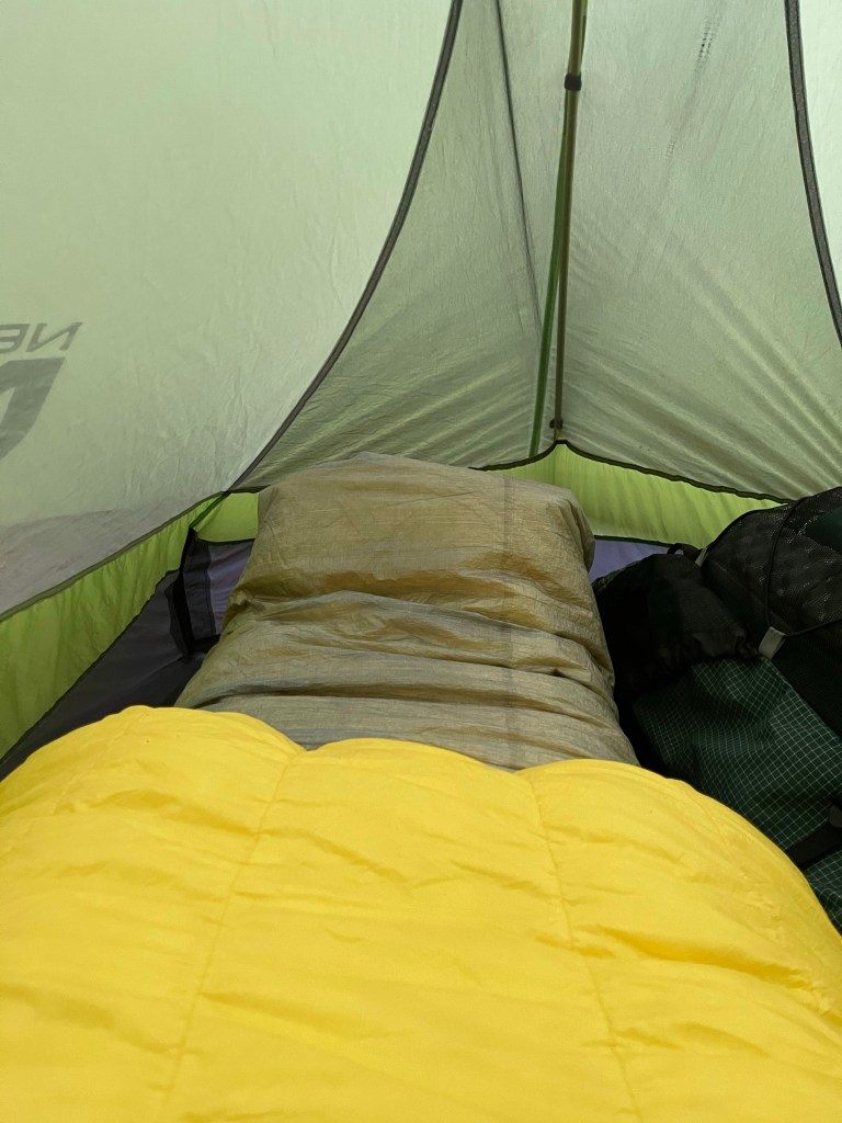 In order to keep my goose down quilt from getting wet, I have my quilt and feet stuffed into my water proof pack liner. I hope it works! I’ll tell you tomorrow!
