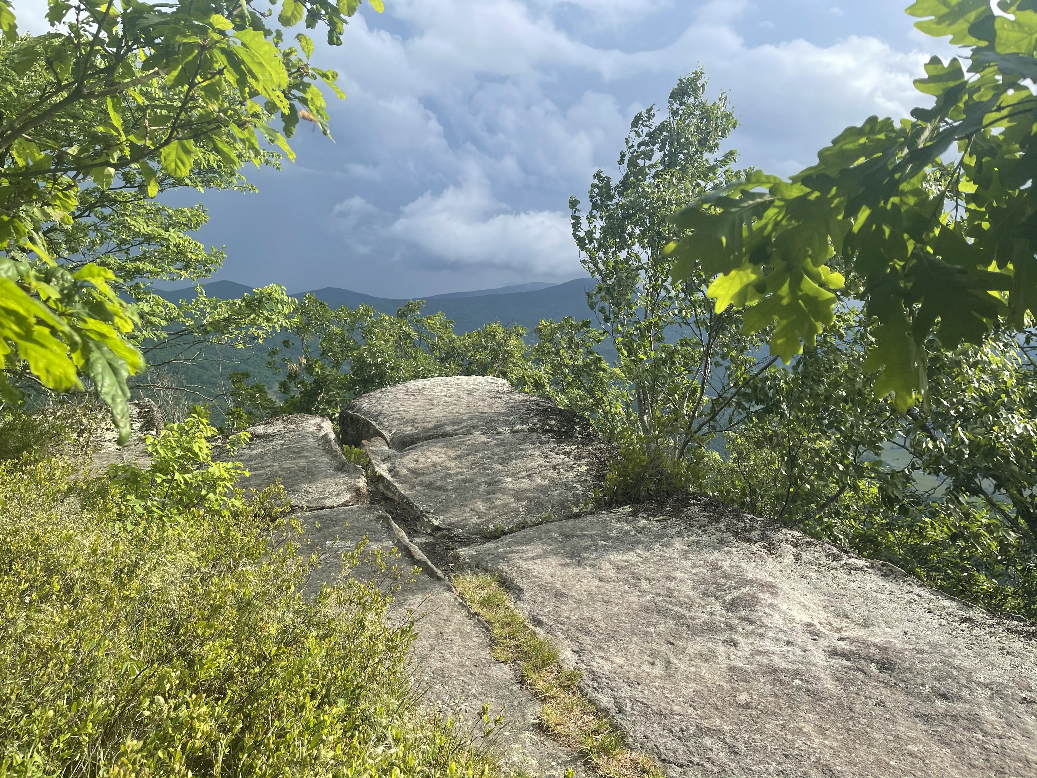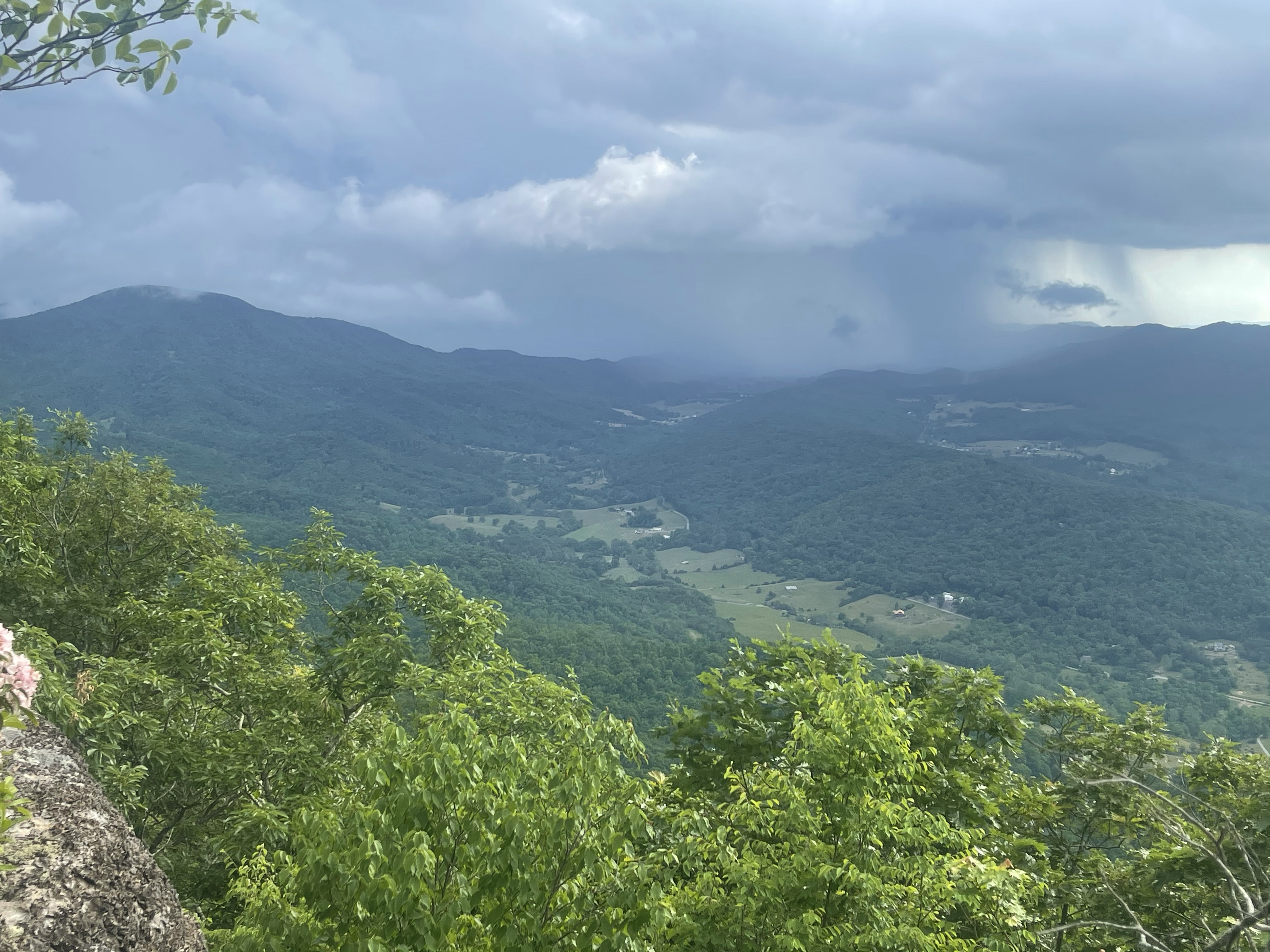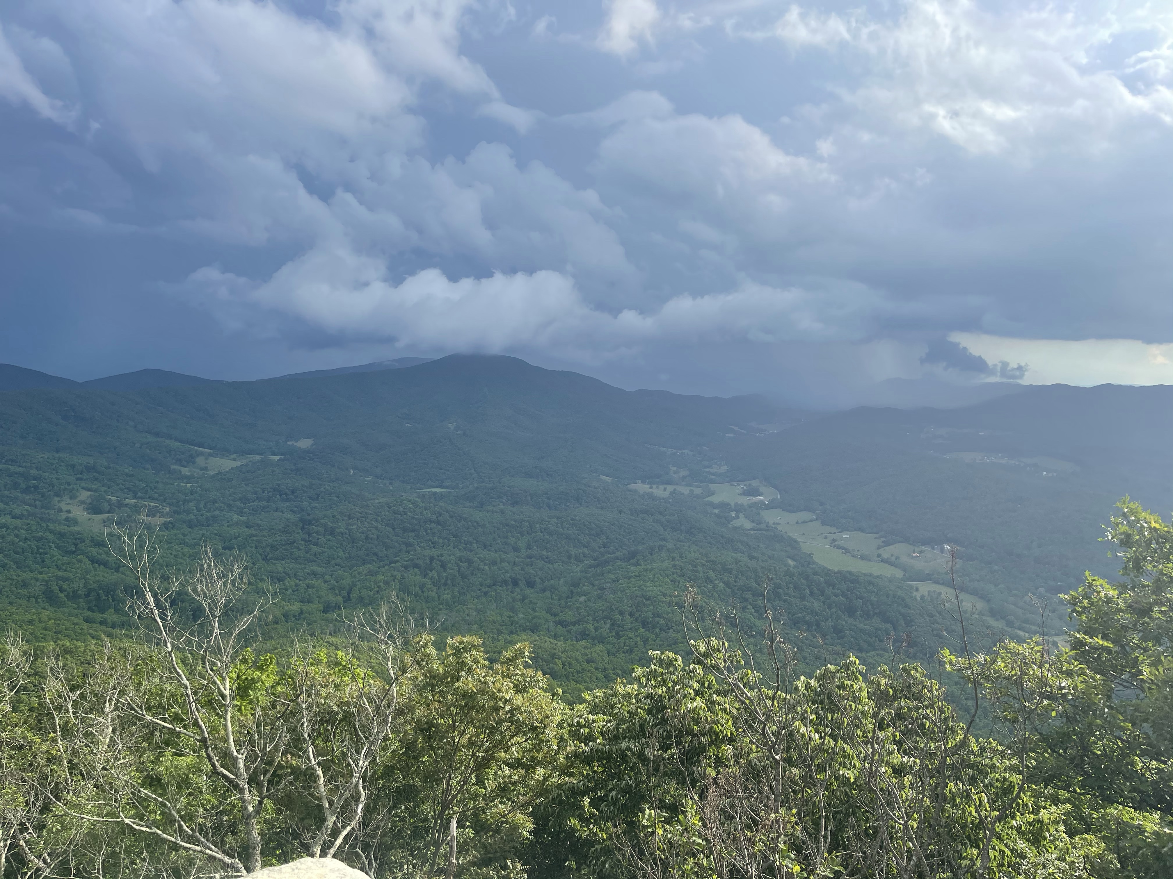 We marched on towards Tinker Cliffs in hopes to enjoy the views that we have heard so much about, and then the thunder started! Today was the second day that we heard the thunder roll and saw the lightening strike! We had roughly three miles left to hike until we got to the shelter so we could at least have somewhere to stay dry while we ate dinner. Well, we walked as fast as we could passed Tinker Cliffs but I managed to stop and grab a picture or two and what did I see, the big dark rain close pushing hard towards us!!