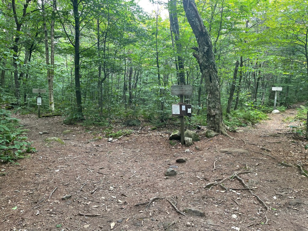We later came to Maine Junction. The significance of Maine Junction is, the Long Trail breaks off from the Appalachian Trail and heads north to Canada. The AT goes east, leaving the Green Mountains of Vermont behind. The Long Trail is the oldest long distance trail in the United States, built between 1910 and 1930 by the Green Mountain Club. The LT totals 273 miles of which we have hiked 105 miles at this intersection. The LT is seen to the left and the AT is seen to the right in this photo.